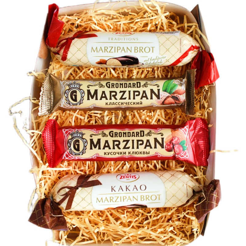 В составе 4 вида марципановых шоколадных батончиков - один весом 100 гр от фабрики Zentis, второй стограммовый добавлением какао, и еще два по 50 грамм каждый от производителя Grondard. Вы можете использовать этот набор как сладкий подарок подруге. Это один из самых романтичных подарков в нашей коллекции, в том числе на 14 февраля. Сладости на подарок ко Дню Влюбленных подходят как мужчинам, так и женщинам. Обратите внимание: на буханке немецкого марципана Zentis вверху указана дата производства, а немного ниже - дата оконания срока годности. Калининградский марципан не входит в состав бокса, но для разнообразия можно попробовать и германские конфеты. Сладкое к чаю и кофе на день рождения для взрослых от шоколадных фабрик в красивой упаковке от именитых шоколадных фабрик можно купить и для себя любимого. Коробочка со сладостями поднимет настроение на несколько дней. В составе двух немецких марципановых батоников 21-23% миндаля, при этом петербургские содержат 33% миндаля. Вкусные это конфеты или невкусные, можно понять достаточно быстро, но рейтинг и отзывы подтверждают качество. В набор входят две иностранные сладости - угощения от Zentis в виде больших батончиков, которые произведены в Германии. Это немецкие марципановые буханки весом по 100 грамм. В состав продуктов из Германии входят сахар, миндаль, инвертный сахарный сироп, какао тертое, сироп глюкозы, какао масло, цельное сухое молоко, эмульгатор лецитин, а российские марципановые буханки содержат продукты содержат дополнительно сироп глюкозный, сорбит, лимонную кислоту. Как зарубежные сладости, так и наши покрыты настоящим шоколадом. Достаточно часто ассорти марципановых батончиков приобретают в качестве идеального подарка учителям на 1 сентября, последний звонок, День учителя, Новый Год, День рождения и другие праздники. Оригинальный шоколад в составе ассорти вкусняшек выбирают также в подарок воспитателям, коллегам, начальникам и директорам. Конфетки в подарок в виде сладких батончиков - это настоящий деликатес к празднику, украшенные декором в виде наполнителя и подарочной ленты. Часто марципановые наборы дарят врачам и медсестрам.