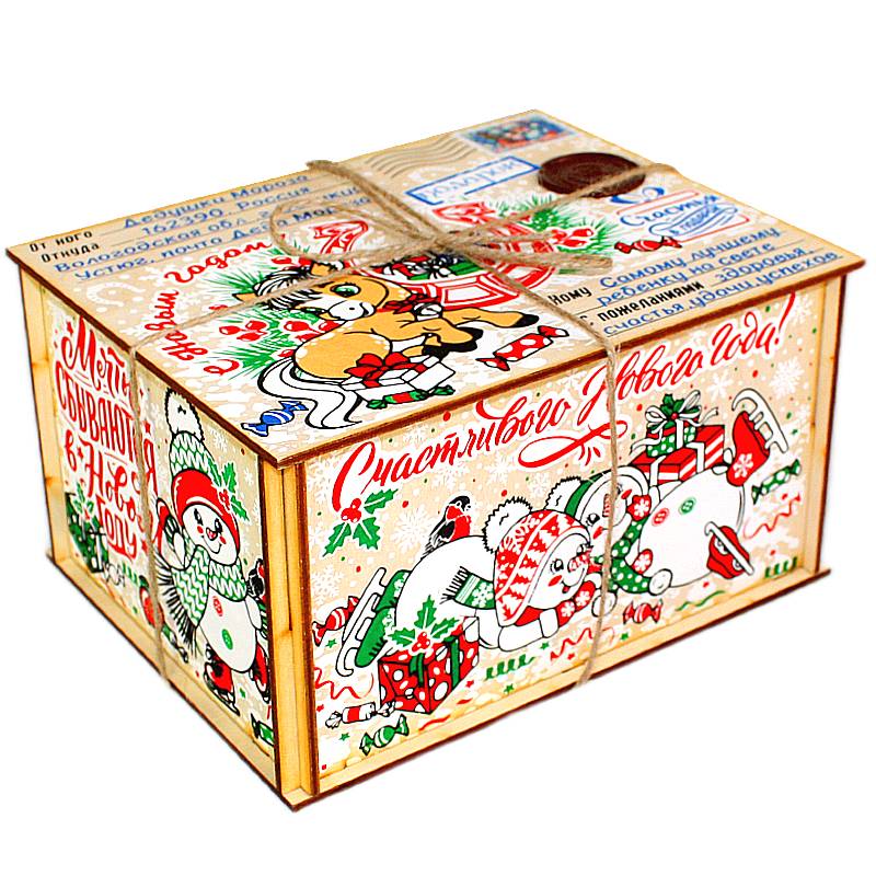 Детский новогодний подарок в  упаковке из фанеры весом 600 грамм