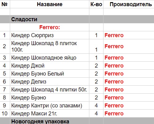 Киндер Сюрприз (2 шт), Киндер Джой (2 шт), Киндер Бонс (2 шт), Киндер Шоколад 8 плиток 100г. (1 шт), Киндер Шоколад 4 плиток 50г. (2 шт), Киндер Делис (2 шт), Киндер Буэно (2 шт), Киндер Кантри (со злаками) (3 шт), Киндер Макси 21 г. (3 шт)